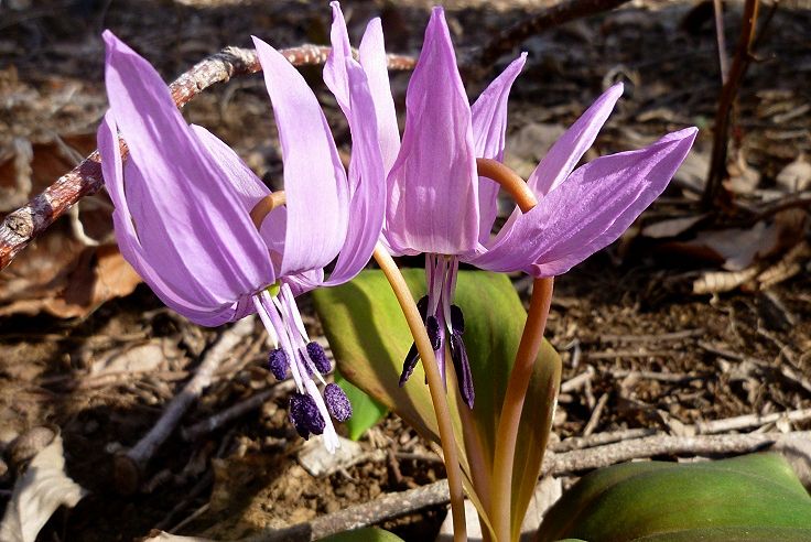 早春に下を向いて薄紫の花を咲かせ、5月上旬頃には葉や茎は枯れてしまい、