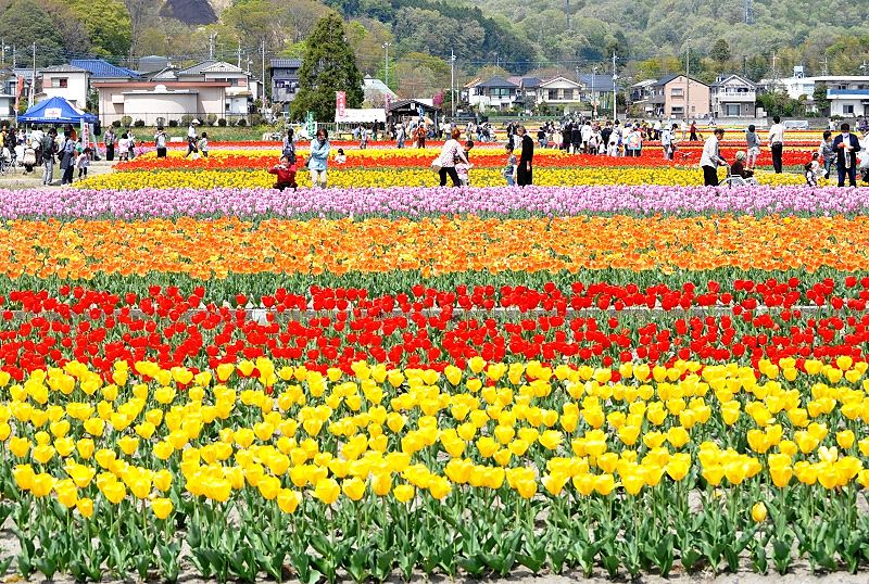 毎年休耕田を使って球根を40万個植栽しての羽村市チューリップ祭り会場 |