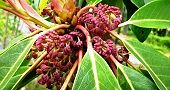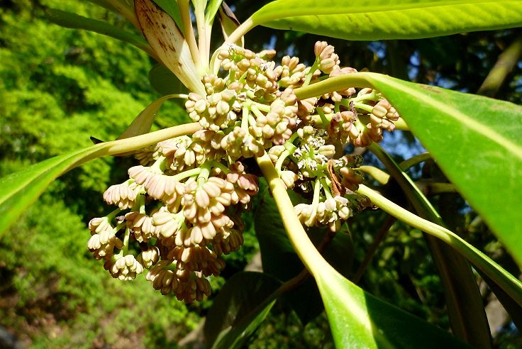 葉は互生し、大形の狭長楕円形で、質が厚く濃緑色。
