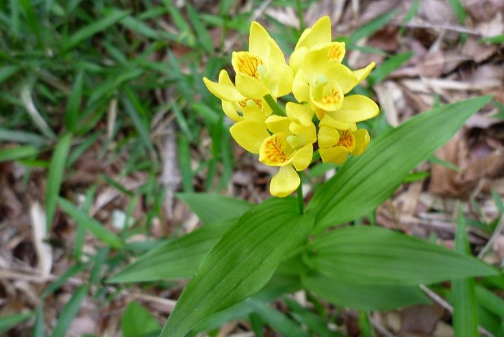 地上性のランで、高さ30〜70cmの茎の先端に4月から6月にかけて直径1cm程度の明るく鮮やかな黄色の花を総状につける。