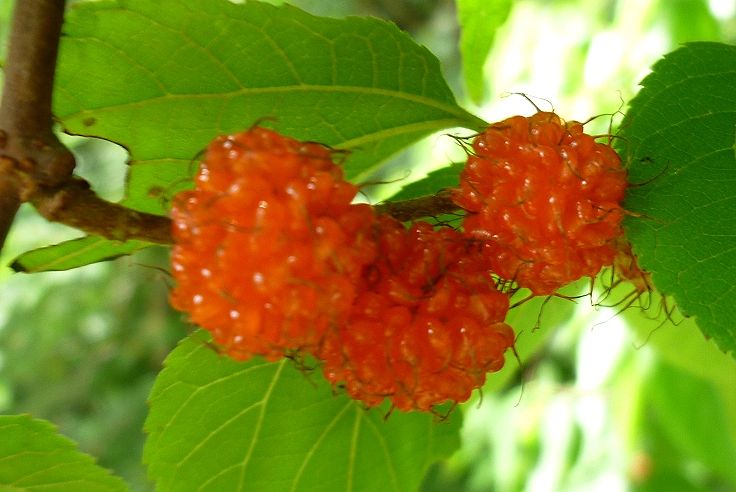 クワ科と同じ球形の実を付けるが、鮮やかな赤い球形で果実は集合果です。
