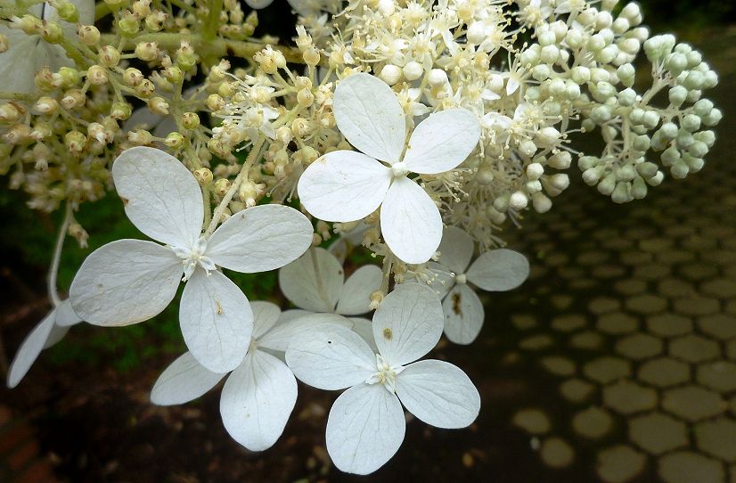 落葉低木で夏に白い花を房状につけます。四弁(がく)の装飾花が目立ちますが、