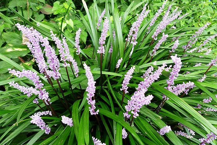 細い花茎先端に穂状花序で多数の薄紫色の小花を咲かせるユリ科ヤブラン属の常緑多年草です。