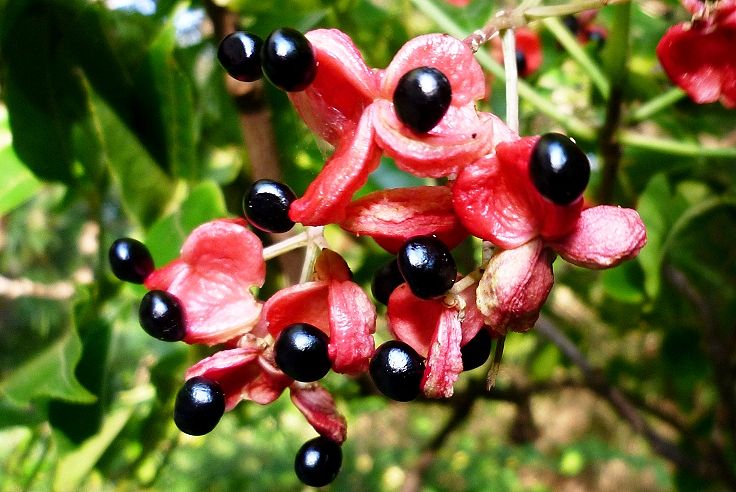 中から黒い光沢のある種子が、1〜2個現れる。赤と黒の対比が結構美しい。