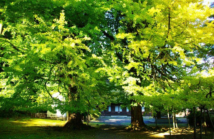 | 秋川渓谷山麓の静寂な広徳寺山門前の対の大銀杏 |