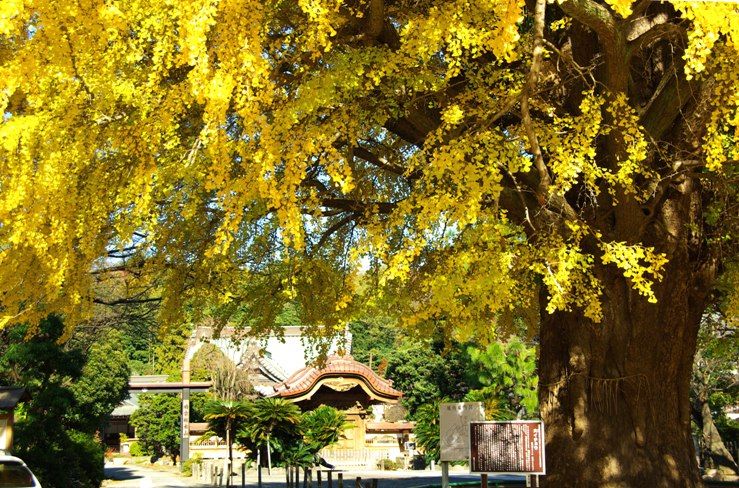 | 境内中央で枝広げそそり立つ大イチョウ |