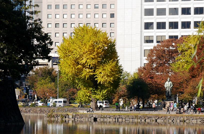 千代田区大手町1丁目にある大手濠緑地の震災イチョウと勤皇の忠臣の和気清麻呂像 |