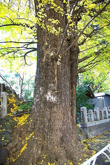 境内東側の歩道にはみ出しているイチョウの幹回り4.8m一本が境界線に立つ。