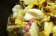 細火でとろとろ白菜とにんにくベーコン塩たら煮、ブロック豚肉薄切りと大根の煮込み、手造りイカ塩辛、最後は稲荷寿司。