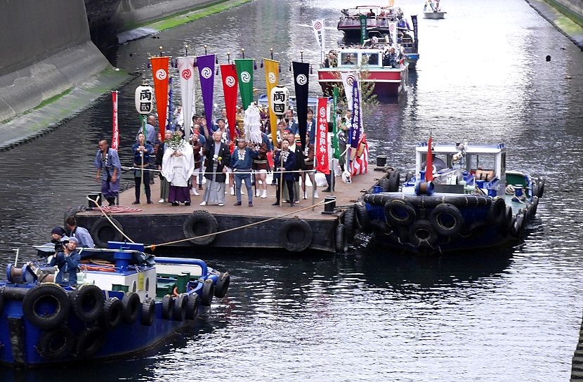 神田川万世橋下流で12年振り船渡御する東日本橋二丁目町会 |