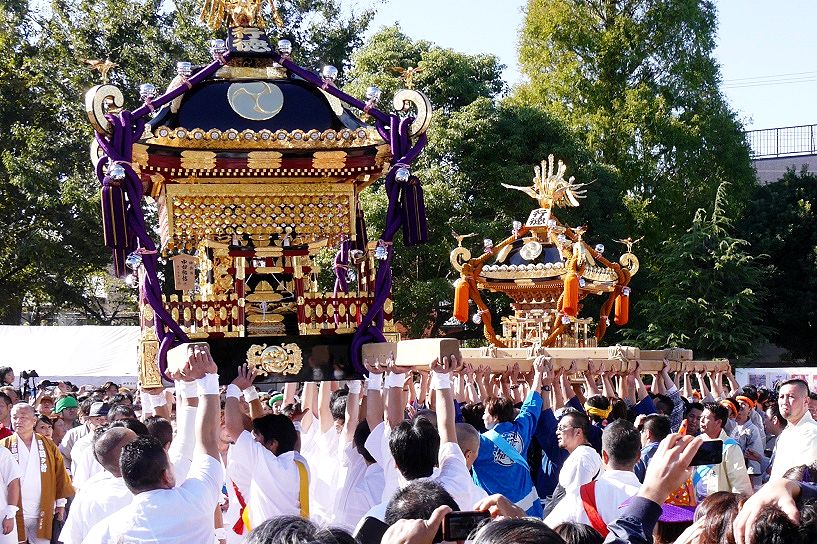行徳湊新田2丁目公園内での巡行前の行徳神輿と江戸前神輿の二基並んでの差し上げご披露です |