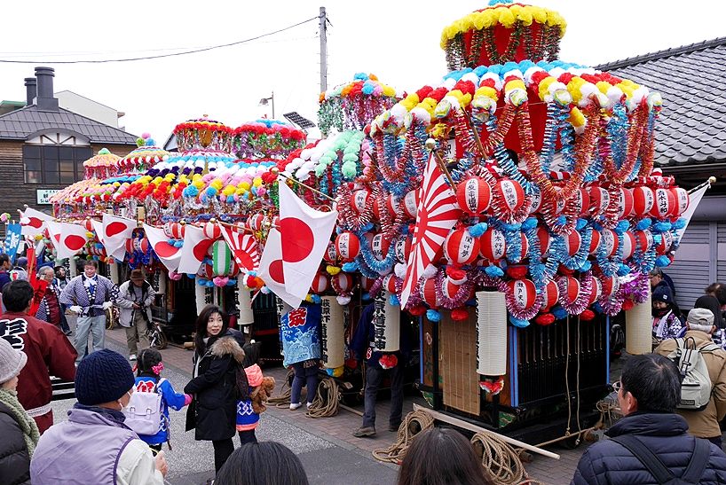 道祖神祭の主役は花車(かしゃ=高さ約3.8m)六台、先導する小神輿三基。