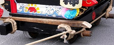 花車の小さな4輪の車輪は車体に固定されおり、舵を切る棒でこじって方向転換させる。