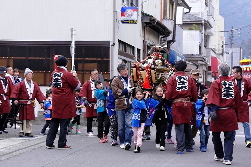 神輿は杉之木(子供担ぎ)、宮下(台座で牽引)、台座83cmの梶山(神輿揉みご披露)。 |