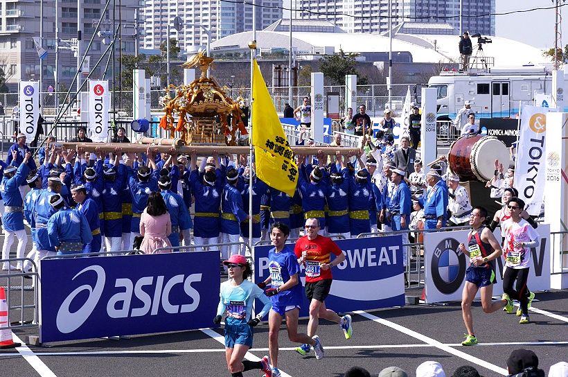 フニッシュの195mの直線コースで深川葵太鼓とわっしょい担ぎの富岡八幡宮神輿総代連合会の神輿揉みでランナーを応援 |