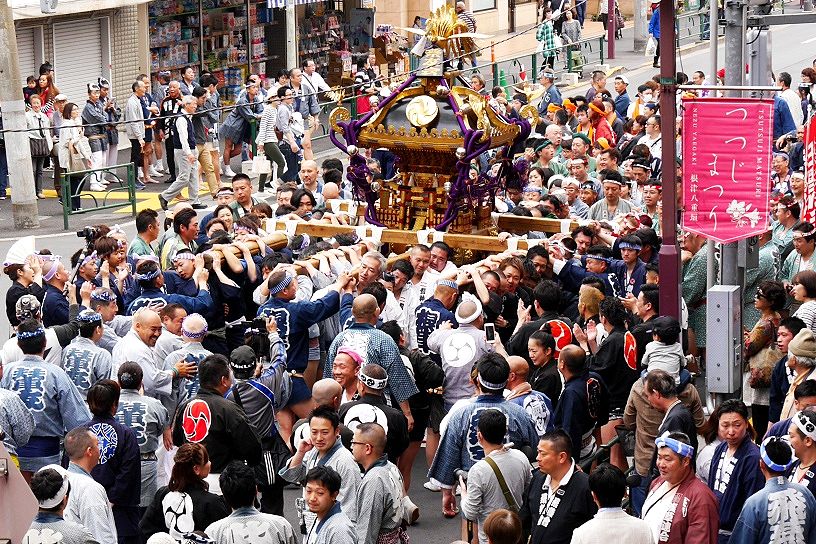 大勢の担ぎ手達に囲まれて根津交番から不忍通りへと台座が三尺一寸の祭友会神輿が躍り出る |