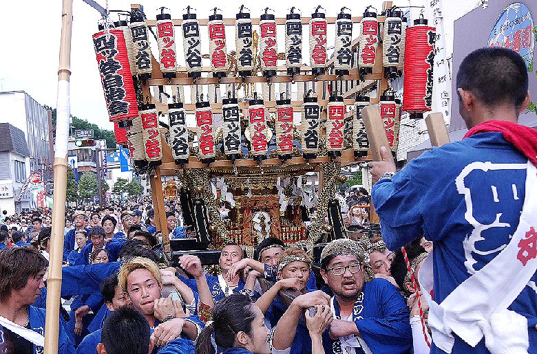 神輿12基、山車8基。が祭典本部が置かれる上溝本町に集結する。 |