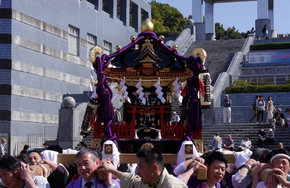 多摩パルテノン (多摩市立複合文化施設)石段前で熊野神社の神輿揉み |