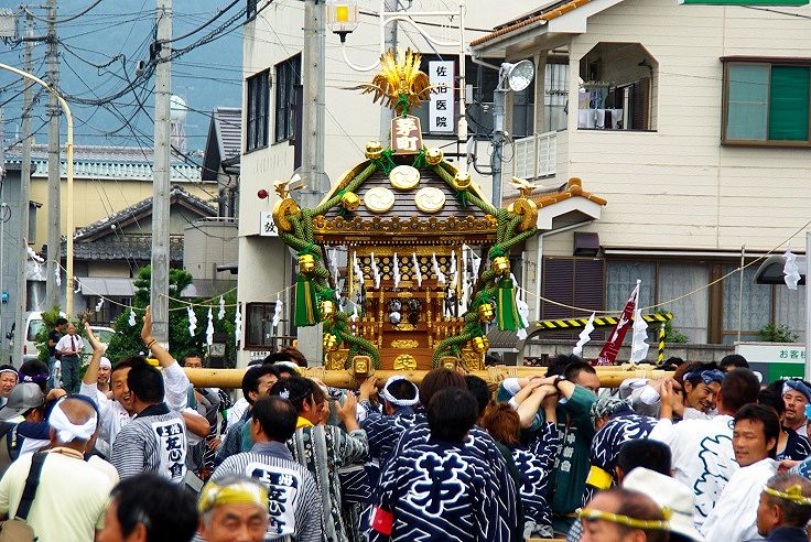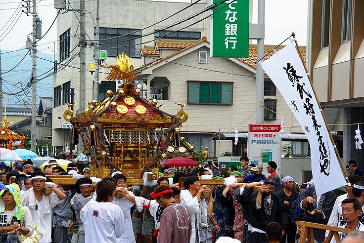 初日、土曜日の夕方から渡御が行われ、年番町(本町、中町、栄町、武町の四町が交替で担当)の神輿が一基だされ、
