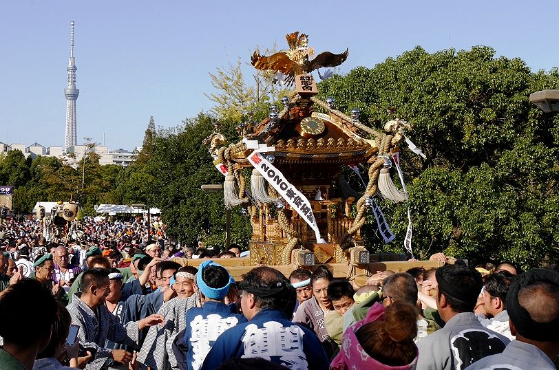 江戸の華の神輿と粋な町の木場大橋と東京スカイツリ