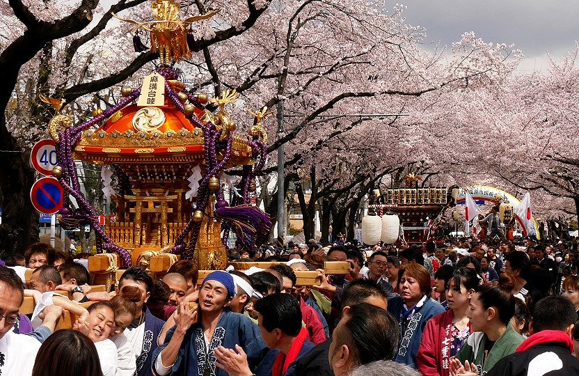 相模原市民桜まつりの殿を勤める田名若者神輿連合会の神輿が賑やかに担ぎ出される |
