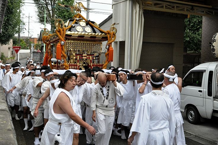 巡行隊列は太鼓、獅子囃子、露払い三匹獅子、神職、氏子役員、白装束で担ぐ大正大神輿、