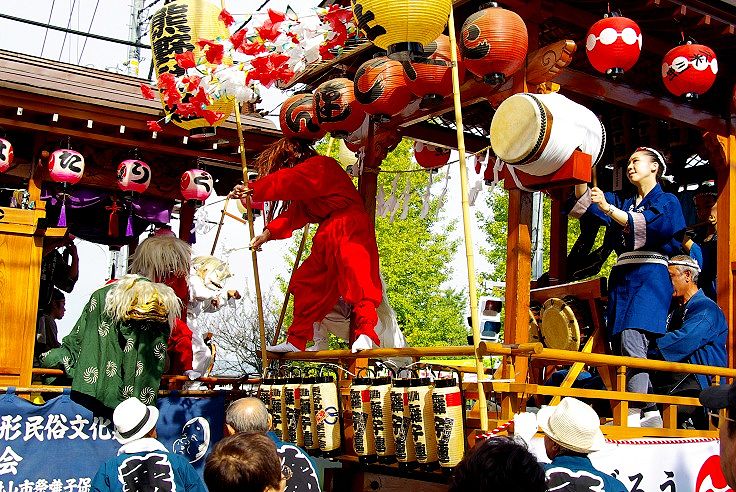 囃子(笛、太鼓、鉦)と踊りで競い合う山車の競演の最大の見せ場なのです。 |