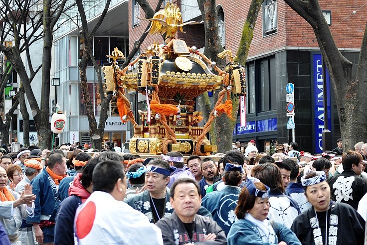 パレードは吹奏楽や鼓笛隊のブラスバンドに、表参道で勇壮な神輿渡御が加わり、