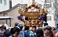 悠然と路地中から現れた台座三尺三寸の品格伝統ともに町会神輿日本一の殿の宮元大神輿