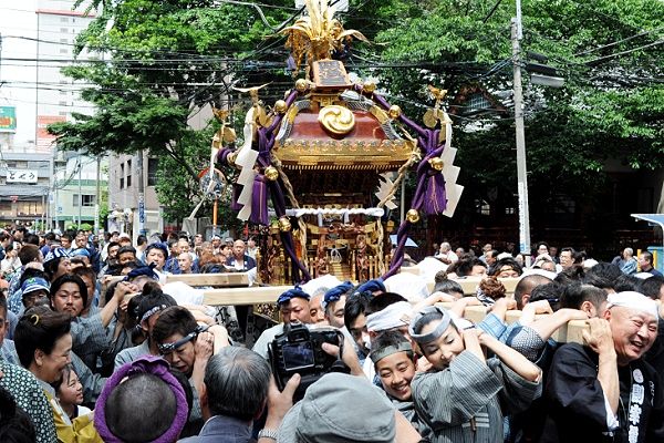 | 三社に負けるなと神社前通りを威勢よく担ぐ |