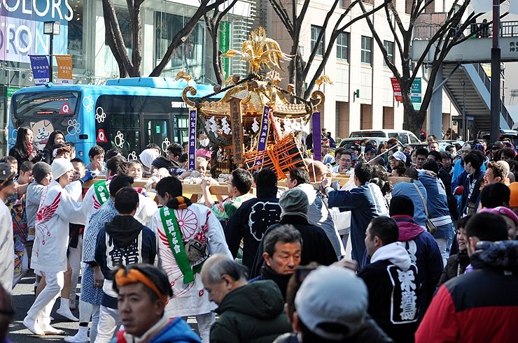 表参道の神宮橋へと威勢のよい掛け声と太鼓やお囃子を奏でながら寒さ吹き飛ばす担ぎ手達 |