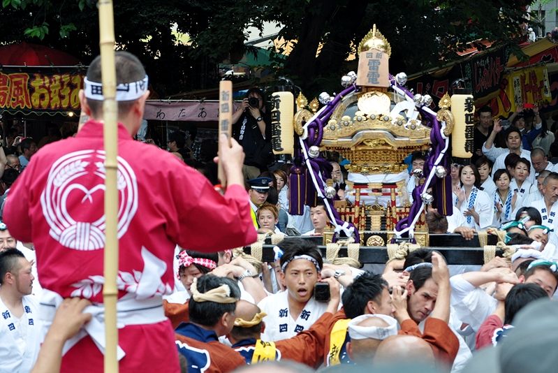 新宿四丁目町会の火焔擬宝珠雷電の担ぎ出し |
