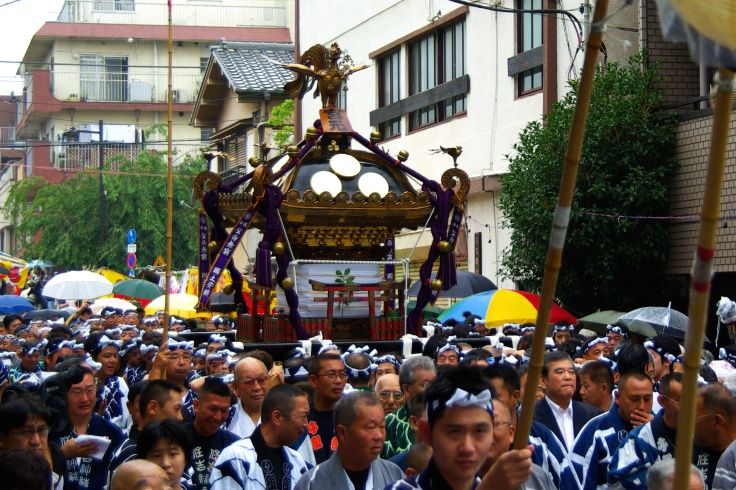 揃衣の若衆が獅子頭の鼻先めがけ殺到する獅子頭宮出しや隅田川を渡御する船渡御祭、江戸三大囃子のひとつである佃囃子にのって、