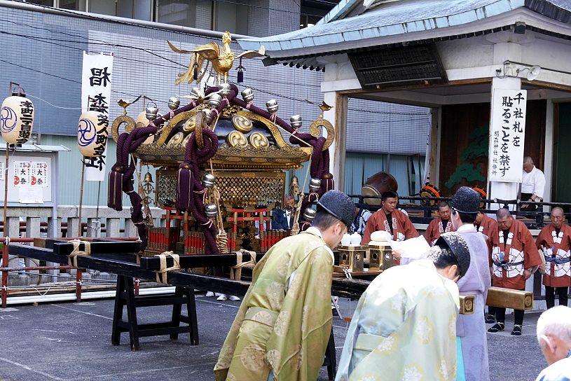神社役員による宮出し渡御が水天宮通りの大観音引渡しの芳人町会御神酒所へ到達です |