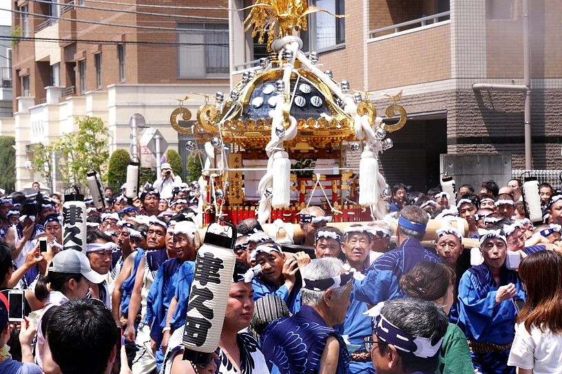 大若衆が担ぐ宮神輿に佃二丁目で遠慮した上品な水掛けなのだがカメラレンズも水飛沫を受けて曇る |