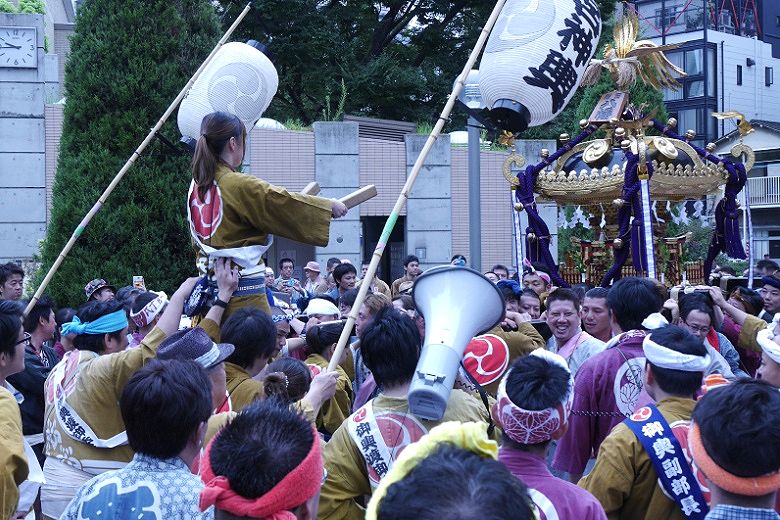 出村通りの蒲田本町お神酒所で氏子青年会の女子が悠然と休息の木を入れる |