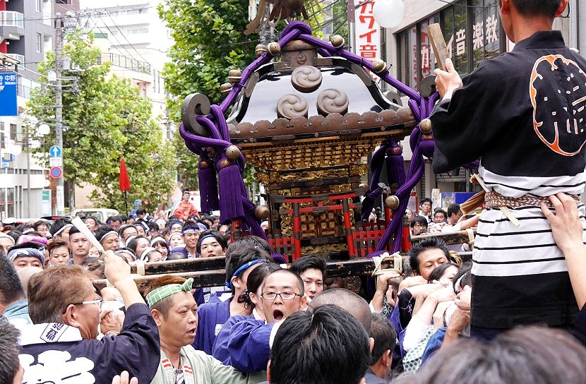 早稲田通りJR高田馬場駅西口を威勢のよい掛け声を響かす明治時代の燻し銀の宮神輿 |
