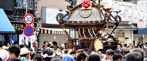 品川神社鳥居と対面の京急新馬場駅北口の新馬場参道から出御の中神輿が準備を整えて待機 |
