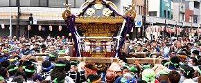 特記: 延軒屋根・平屋台造り千貫神輿 担ぎ手は1600名。市指定文化財。昭和52年改修工事。 |