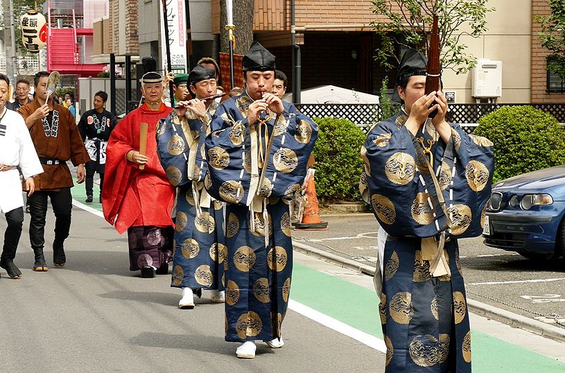 渡御路を清める様に雅楽が奏でられ宮司が続く |