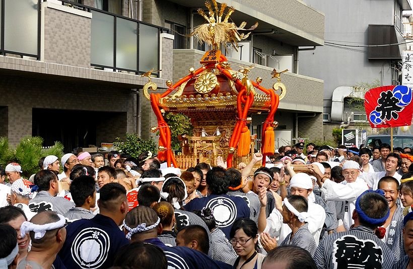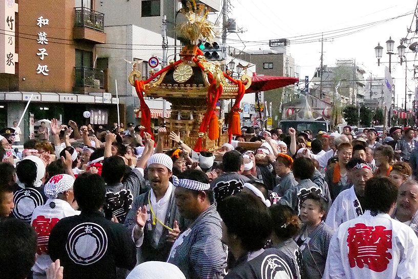 環七横断で威勢の良い掛け声と担ぎ手達が興奮の雄叫びを上げる |