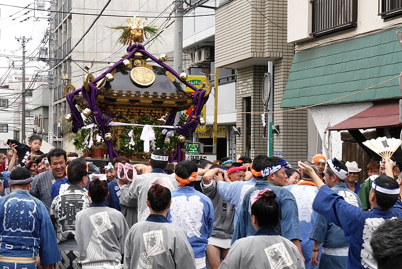 特記: 八王子市多賀神社から譲り受けた神輿 三つ葉葵紋(丸に三つ葉葵=徳川葵紋)の延軒屋根 平屋台造りの大神輿 |