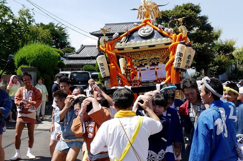 猛暑日の祭礼で小休止後体力復活したのか威勢良い掛け声で東水元4丁目の農村集落を渡御 |