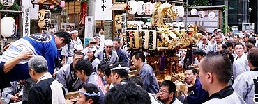 | 神田囃子奏でる底抜け山車が宮神輿を先導する |