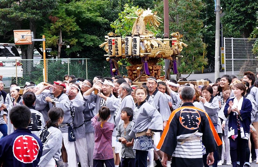 大久保の細い路地中をギリギリ器用に渡御してくる |