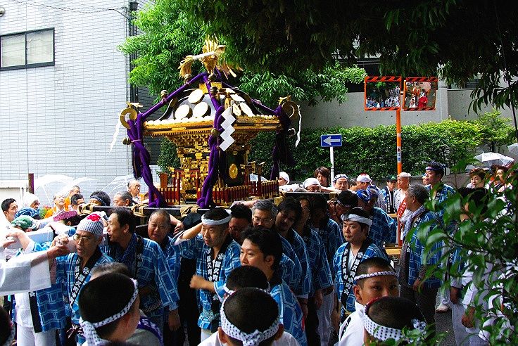 朝から降り出した雨の中を西向天神社の宮神輿が渡御 |