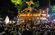 日曜日の朝神社を出た本社神輿は各町内の担ぎ手たちに次々と橋渡しされ夜になって神社に戻ってきます。