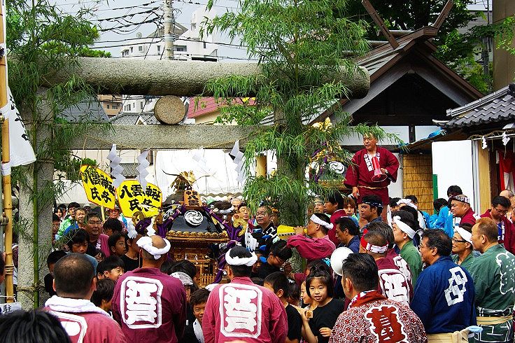 八雲神社バス通りを大団扇で囃し立て宮神輿の担ぎ手を鼓舞する氏子衆 |