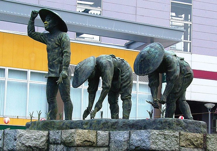京王線北野駅北口前のロータリーの像。田植えの像は、昭和41年から56年に、