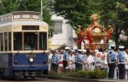大勢の警備員に守られた尾久八幡神社の宮神輿の横を都電が通り過ぎる |